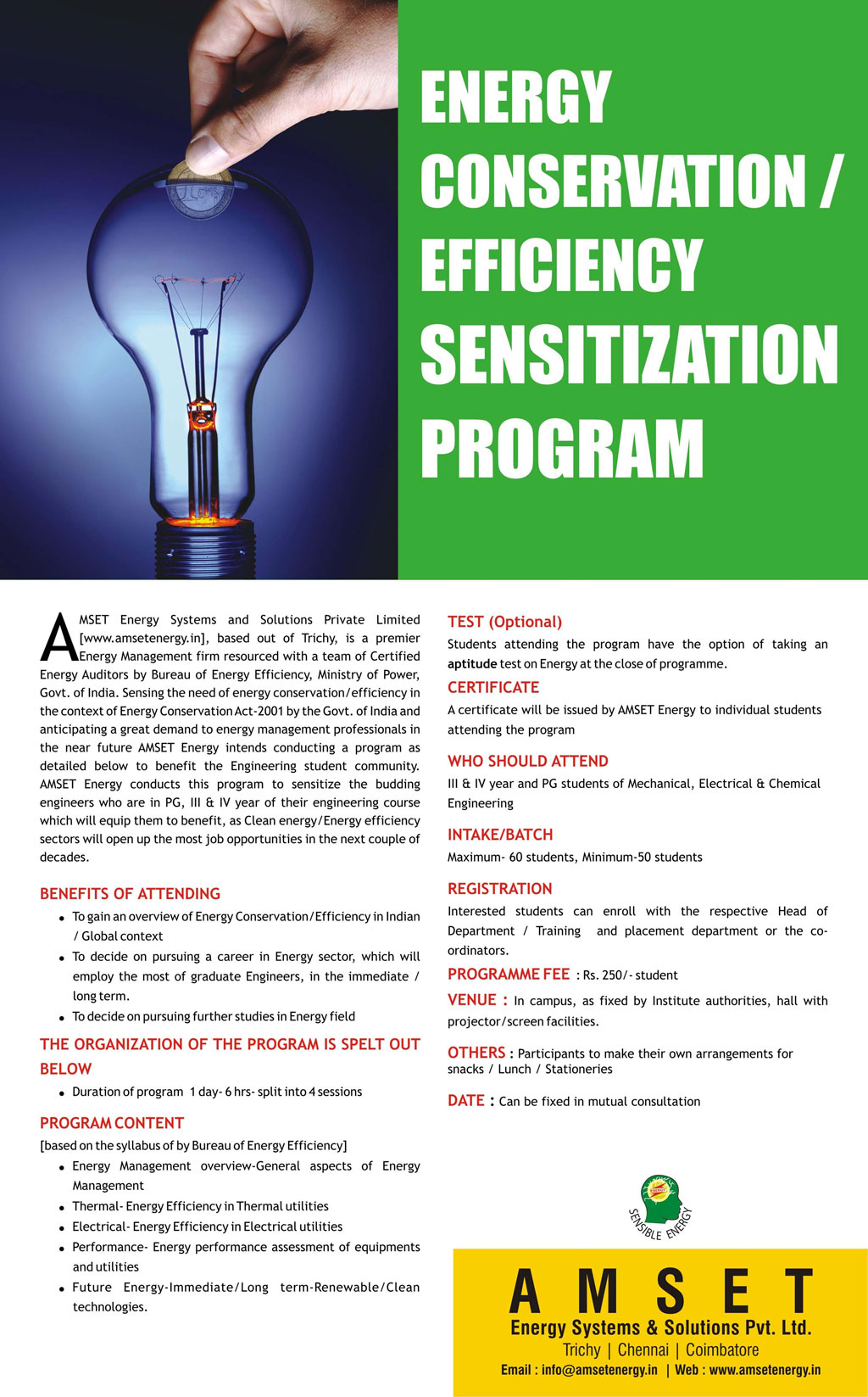 Corporate Traning / Awareness program on Energy costs-conservation-efficiency Energy Audits-Preliminary [walk-through] and Investment grade Carbon advisory-mitigation services Water audit Power quality audit Total Cost Management-Process approach-Energy + Material + Wages- Cost of Energy related to other major costs. Future Energy- evolution of new Energy technologies Excellence in Energy Management-a journey comprising above